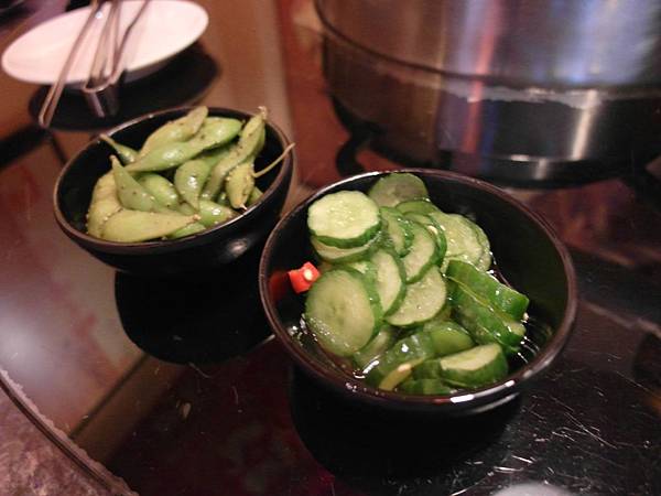 等火鍋前也不要閒著~還有附餐小菜可以吃唷~醃黃瓜和毛豆都挺開胃的~好吃冰冰涼涼的 讓我吃了麻辣鍋後還是會夾來吃吃去去火